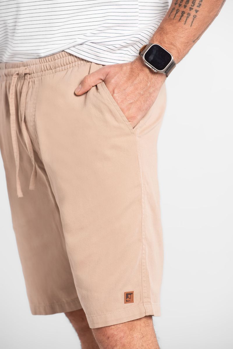 Bermuda masculina confeccionada em sarja, tecido firme e resistente, ideal para composições casuais. Possui cós elástico com cordão funcional, que garante conforto no ajuste, além de bolsos laterais e traseiros funcionais, braguilha e etiqueta decorativa em corino. Versátil, pode ser combinada com camisetas básicas ou polos para diferentes ocasiões.