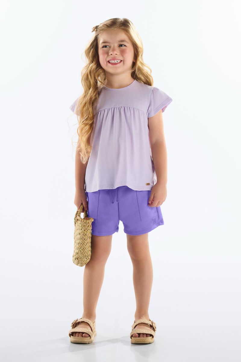 Blusa infantil para menina, confeccionada em meia malha macia com recortes franzidos e acabamento delicado. O modelo possui mangas curtas com babado, abertura posterior com botão funcional e plaquinha personalizada na barra. Uma peça leve e charmosa, ideal para os dias quentes da estação.