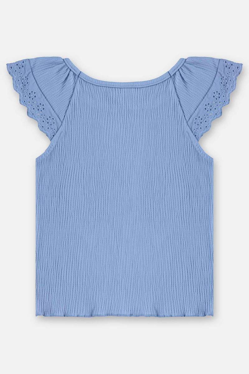 Blusa infantil para menina, confeccionada em malha texturizada com elastano, que proporciona conforto e liberdade de movimento. O modelo possui mangas raglan com babados franzidos e acabamento delicado em fru-fru, além de plaquinha decorativa na barra. Ideal para compor looks frescos e charmosos nos dias quentes.