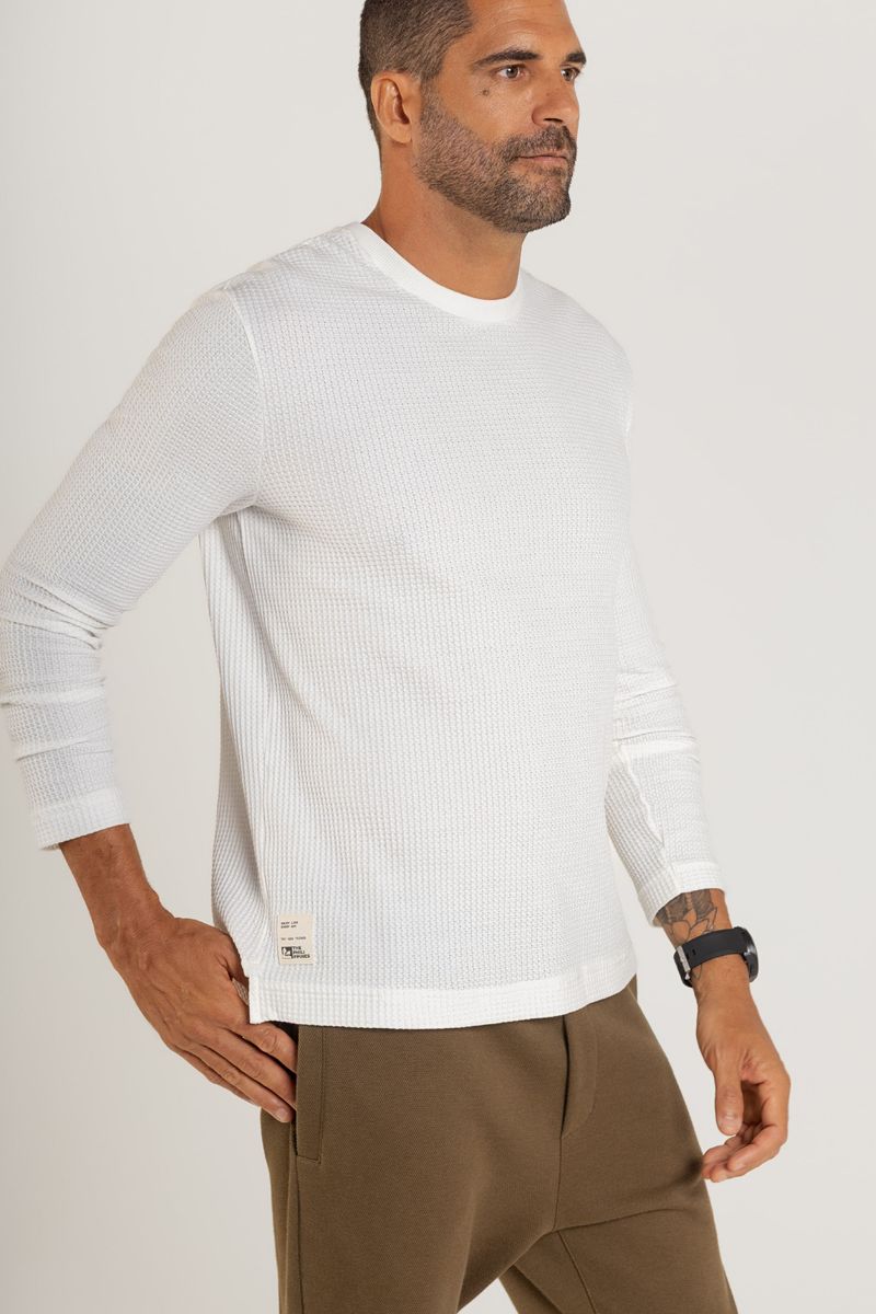 Camiseta masculina confeccionada em malha com textura em relevo (algodão e elastano). Possui gola redonda em ribana, garantindo conforto e ajuste perfeito ao corpo. A peça conta também com abertura lateral, adicionando estilo e etiqueta personalizada da marca.