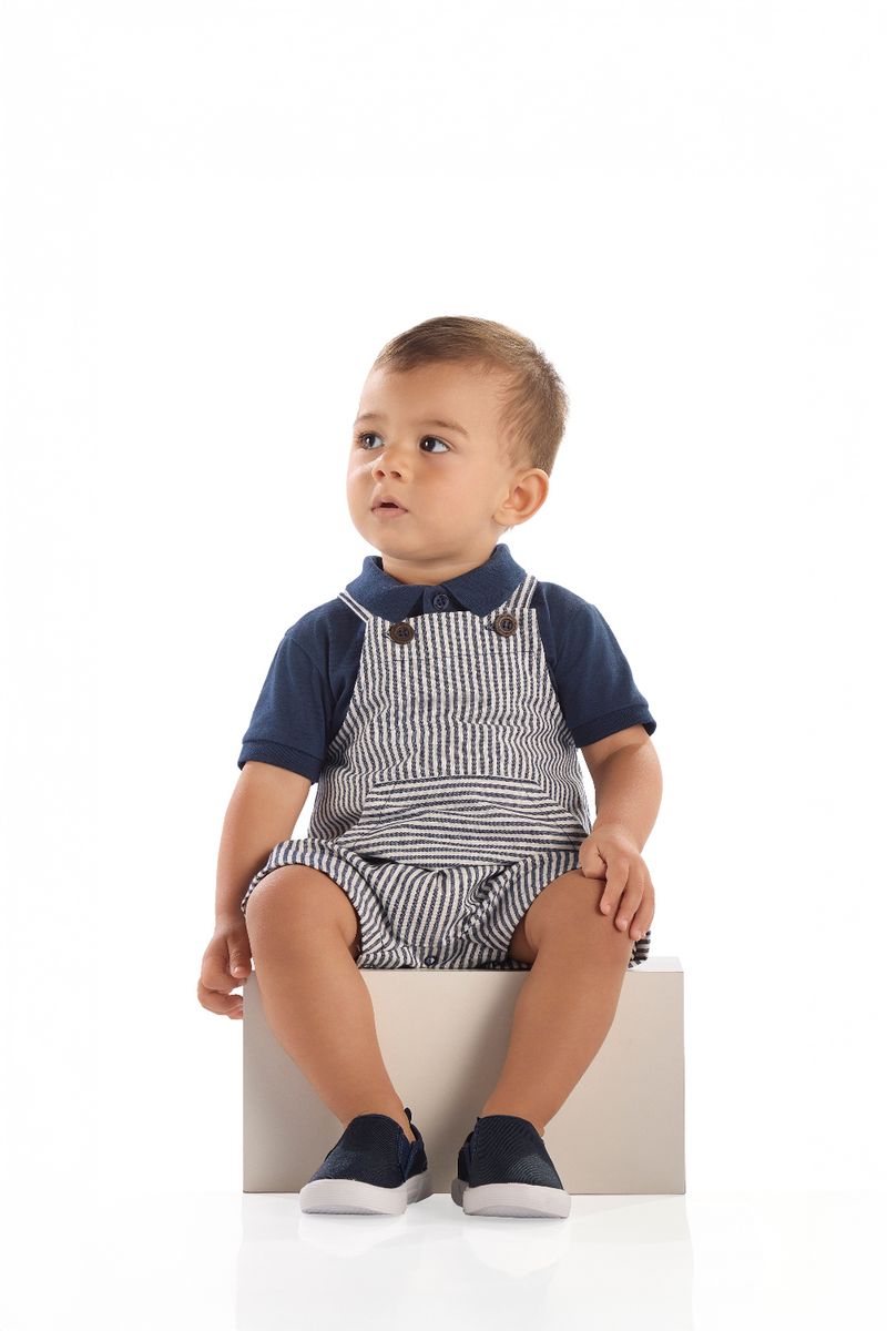 Conjunto para bebê menino composto por camisa polo em algodão que garante frescor e conforto. Possui gola e punhos em retilínea, abotoamento frontal e costura reforçada, trazendo um toque clássico ao visual. A jardineira em tecido de viscose listrado apresenta etiqueta personalizada, bolso canguru, alças que passam por caseados e fechamento com botões de pressão entre as pernas, facilitando na hora de vestir e trocar. Uma opção perfeita para acompanhar o ritmo animado dos pequenos tanto no dia a dia quanto em momentos especiais de verão.
