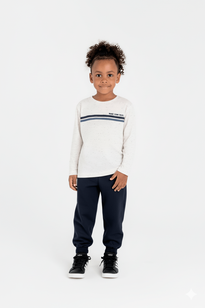 Estiloso e confortável, este conjunto para menino é perfeito para o dia a dia. A blusa, confeccionada em meia malha botonê, tem mangas longas e uma estampa em 3D que dá um toque moderno ao look. A calça, feita em moletinho, possui elástico na cintura e nos punhos, oferecendo ajuste confortável e liberdade para brincar com muito estilo.
