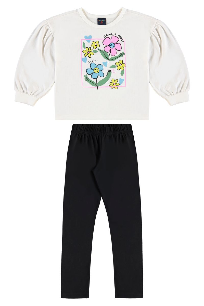 Delicado e cheio de charme, este conjunto para menina é ideal para o dia a dia com estilo. O blusão, confeccionado em malha rustic, tem mangas longas com franzido, punhos confortáveis e uma encantadora estampa de flores com glitter. A legging em cotton possui elástico na cintura, garantindo ajuste perfeito e liberdade para brincar com conforto.
