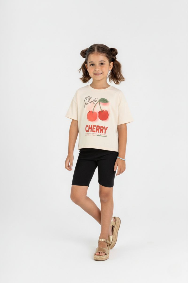 • Conjunto infantil para meninas, composto por uma blusa confeccionada em meia malha, acompanhada por uma bermuda ciclista em cotton, peças que são ideiais para sua pequena aproveitar o verão com conforto. A blusa possui gola arredondada em ribana, cavas dos ombros deslocadas e estampa de cerejas, que complementa a peça e dá um toque especial ao conjunto. A bermuda possui elástico na cintura, que se ajusta conforme o corpo da pequena, fazendo com que a peça não caia.
