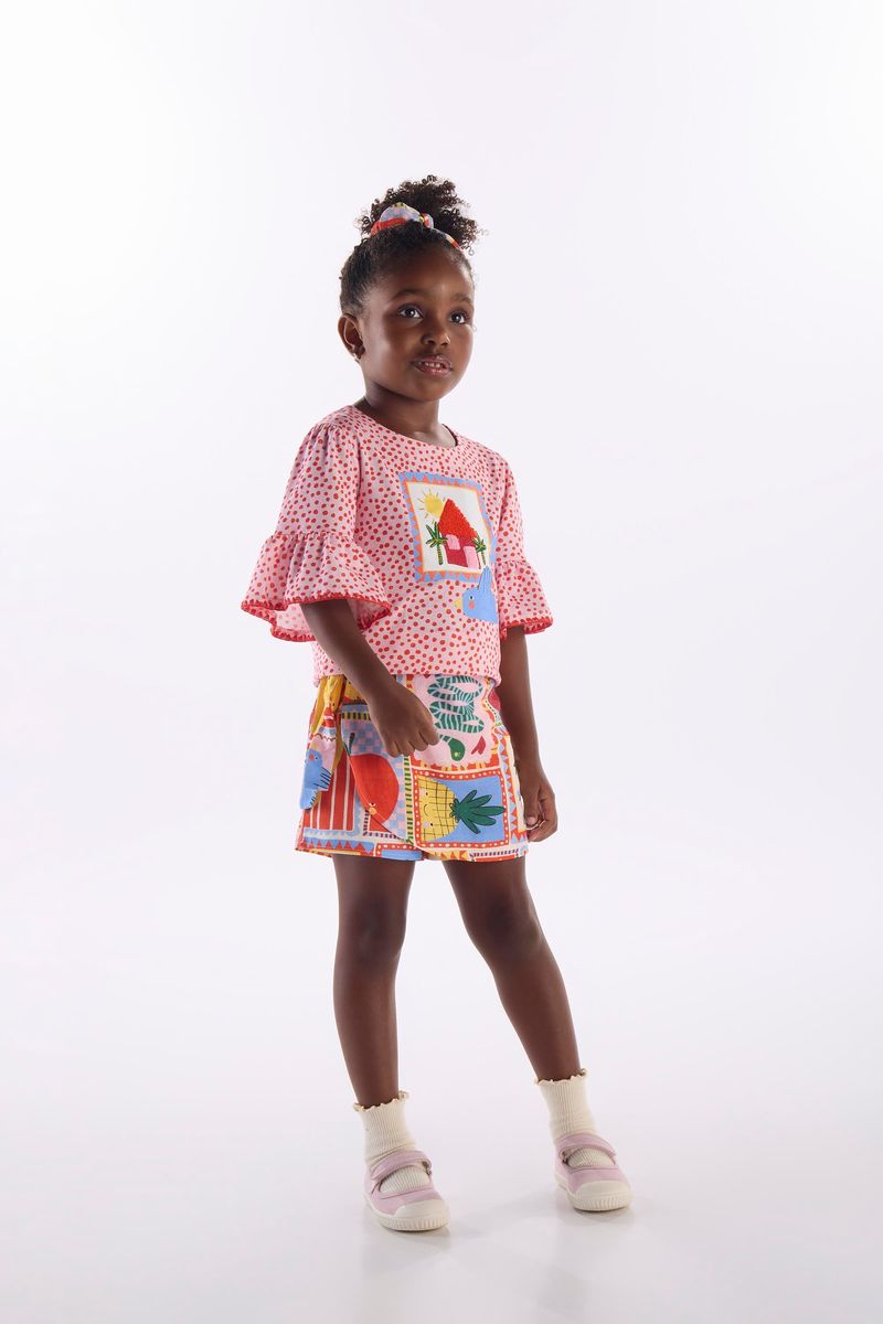 Este conjunto é perfeito para oferecer conforto e estilo no cotidiano das meninas. A blusa, confeccionada em meia malha com viscose, possui uma estampa detalhada com bordado, mangas sutilmente franzidas e um acabamento elegante em ponto concha. O short-saia, feito em viscolinho com estampa digital, inclui cós elástico e um laço para amarrar, garantindo praticidade e um toque especial de charme. É a opção ideal para os dias quentes de verão.