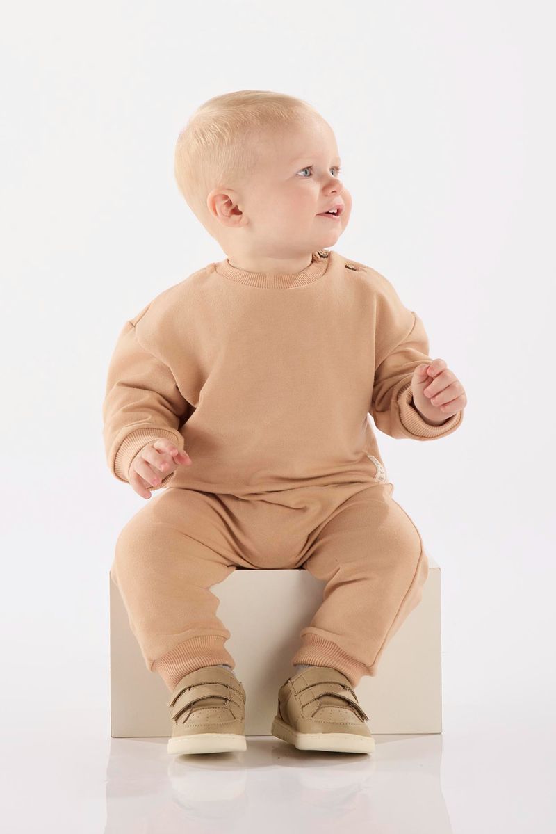 Esse conjunto, feito em molecotton sustentável sem felpa, é perfeito para acompanhar os bebês com suavidade e liberdade de movimento. O blusão conta com gola, punhos e barra em ribana canelada para um ajuste perfeito, além de abertura frontal com botão no ombro para facilitar na hora de vestir. Já a calça saruel tem cós elástico com cadarço decorativo, bolsos falsos e punhos ajustados, garantindo um caimento moderno e confortável.