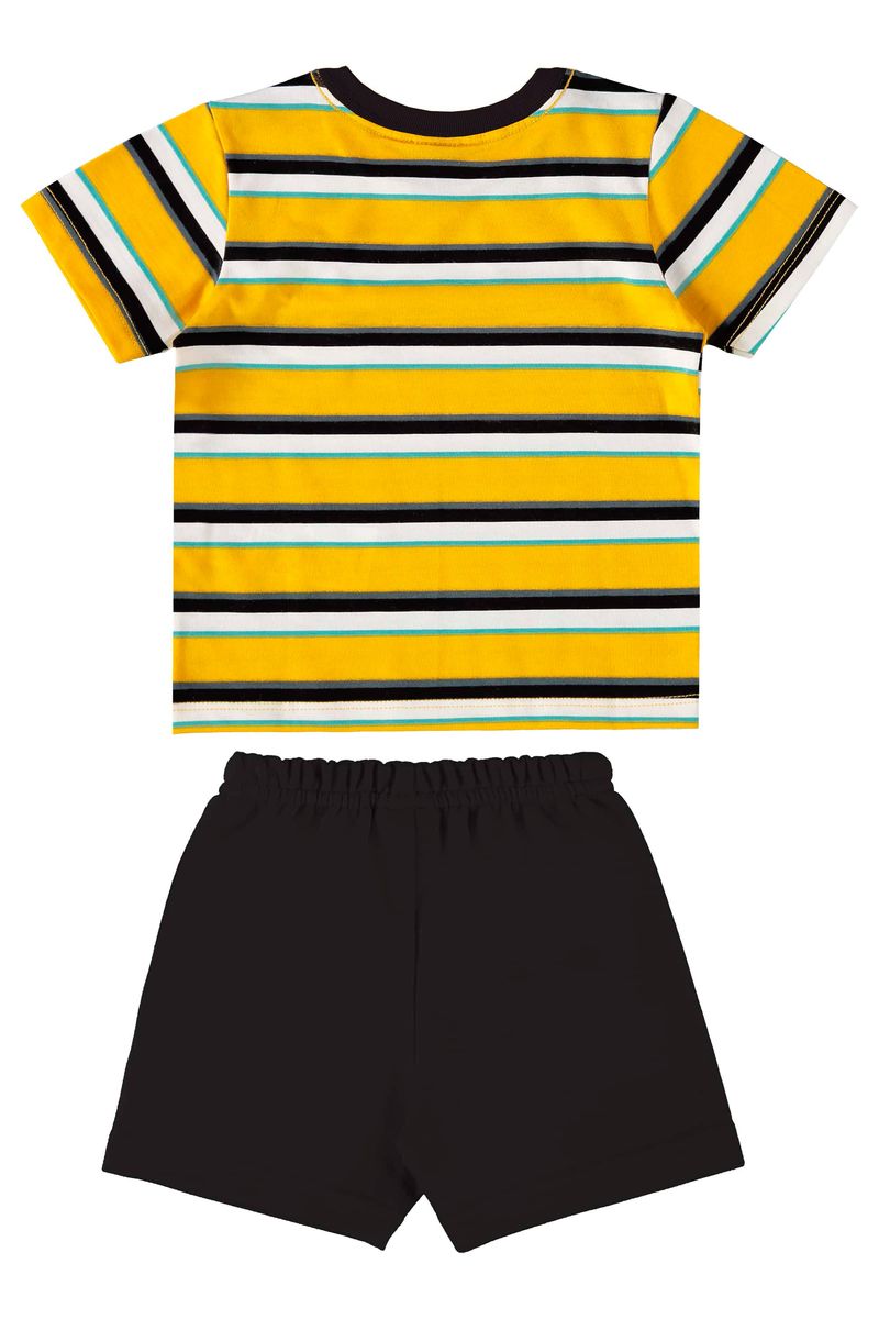 Conjunto para bebê menino, perfeito para garantir conforto e estilo nos dias quentes. A camiseta é feita em meia malha de algodão e se destaca pela estampa listrada colorida, gola em ribana e acabamento com costura dupla. A bermuda, confeccionada em moletom sem felpa (mistura de algodão e poliéster), possui modelagem soltinha e cós com elástico, proporcionando total conforto e liberdade de movimento.