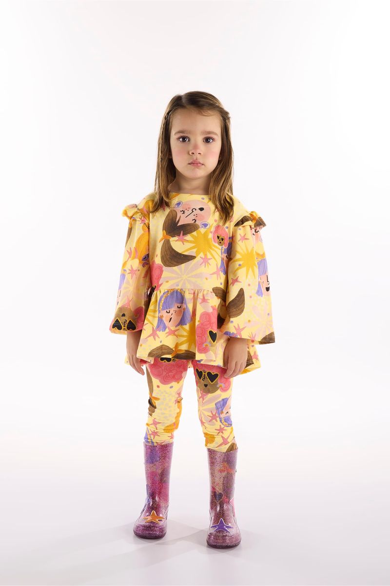 Este conjunto infantil para menina inclui uma blusa e uma calça legging, ambas confeccionadas em molecotton sem felpa com viscose. A blusa apresenta recortes franzidos na frente, costas e mangas, além de um charmoso babado franzido, acabamento em ponto concha, patch termocolante e abertura nas costas com faixa para amarração. A legging possui cós elástico para um ajuste confortável. As duas peças contam com estampa digital, garantindo cores vibrantes e desenhos de alta definição.