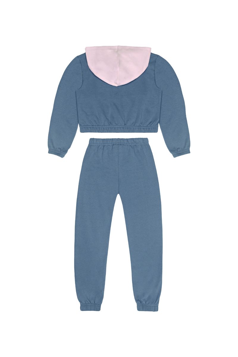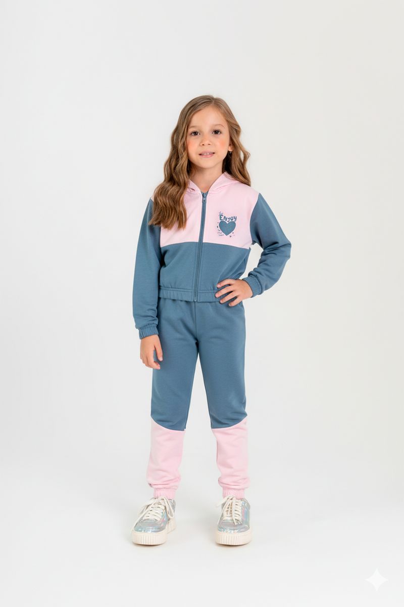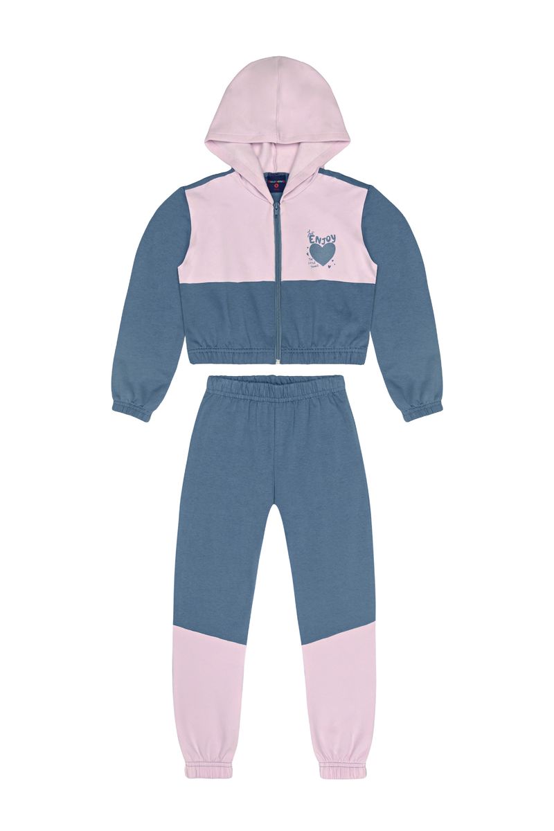 Conjunto infantil para menina confeccionado em molecotton com felpa (algodão e elastano), ideal para os dias frios. A jaqueta possui capuz, fechamento por zíper, estampa com efeito falso fóil, recortes em cores contrastantes e elástico na barra e punhos. A calça conta com elástico confortável na cintura e nos tornozelos, e recortes que complementam os recortes da jaqueta. Um look prático, quentinho e cheio de estilo para o inverno.