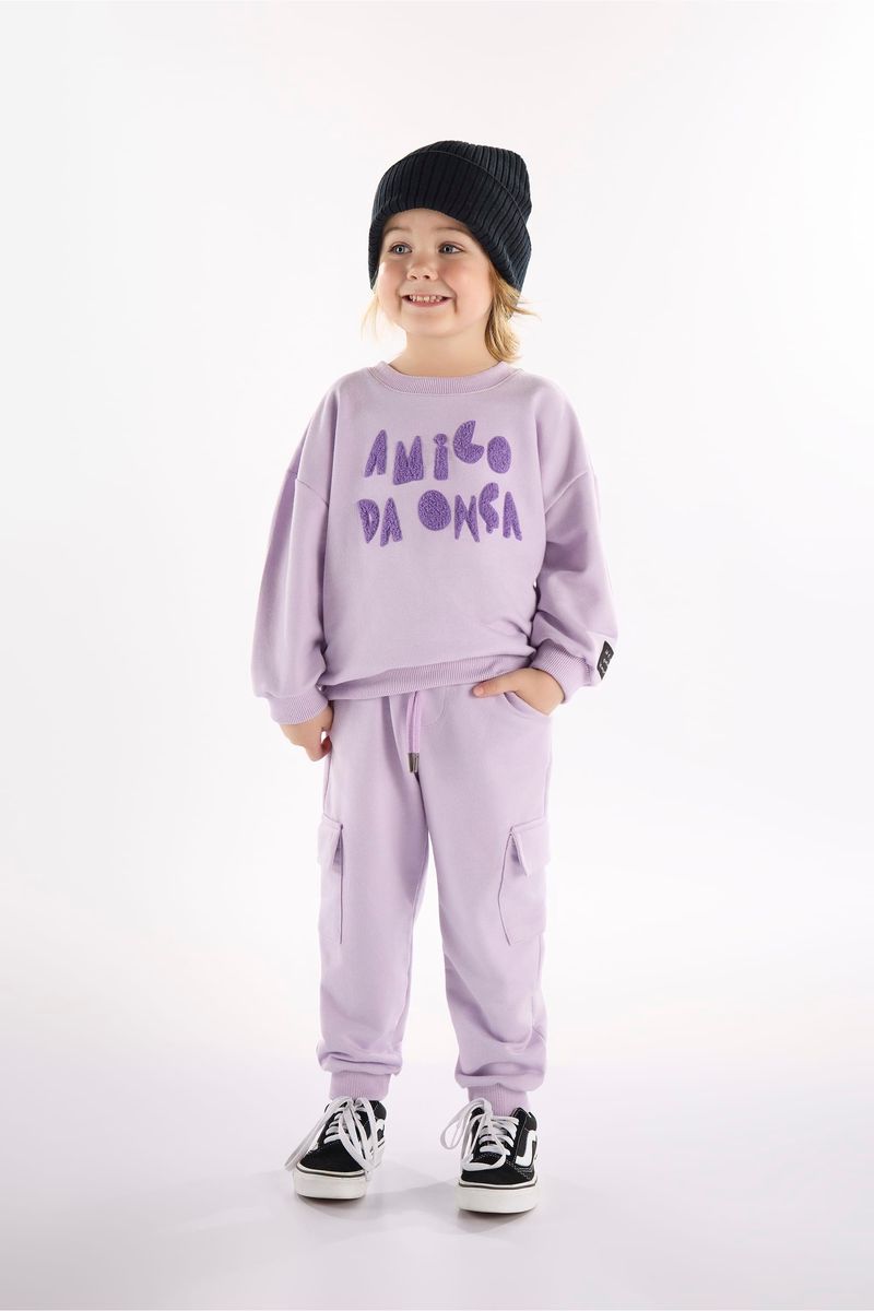 Este conjunto infantil masculino, perfeito para os dias frios, inclui um blusão e uma calça, ambos fabricados em moletom felpado. O blusão apresenta punhos, barra e gola em ribana canelada, garantindo um caimento confortável, além de um bordado frontal e uma divertida estampa de onça nas costas. A calça dispõe de cós elástico, passadores para cadarço na cintura, bolsos laterais, braguilha decorativa e punhos, que asseguram um ajuste ideal ao corpo, combinando conforto e estilo.
