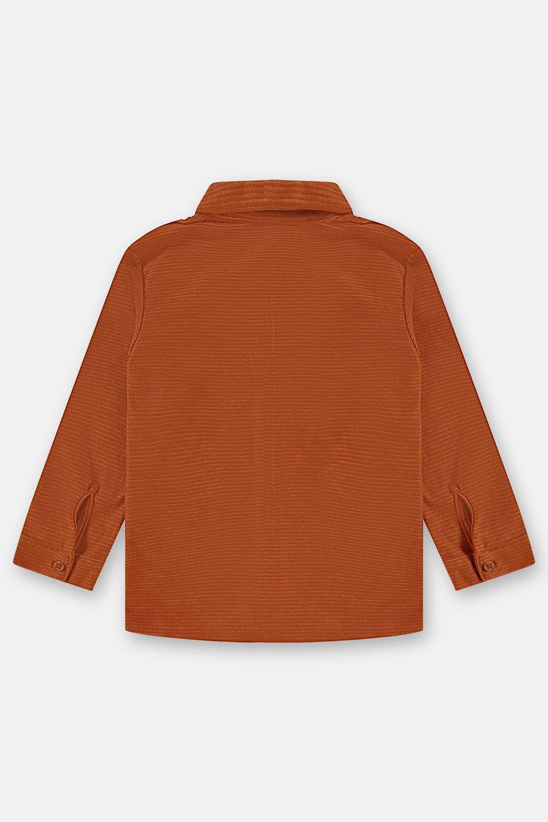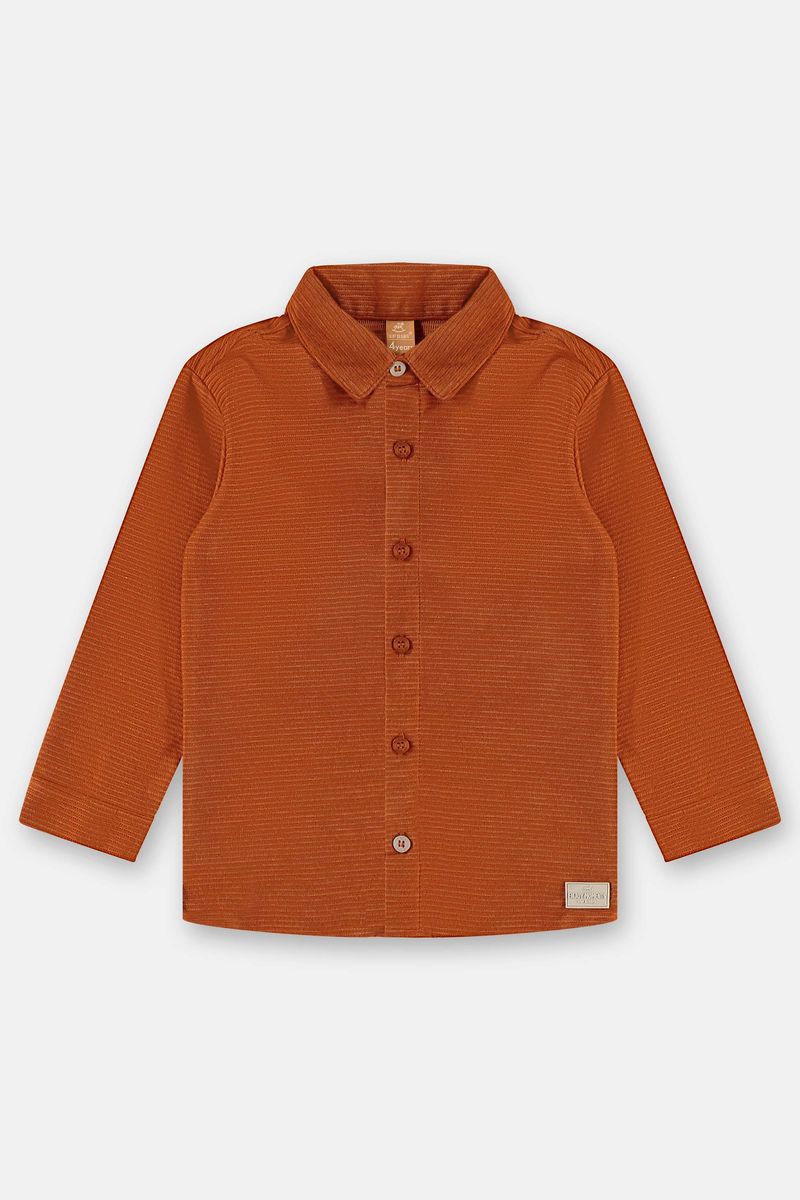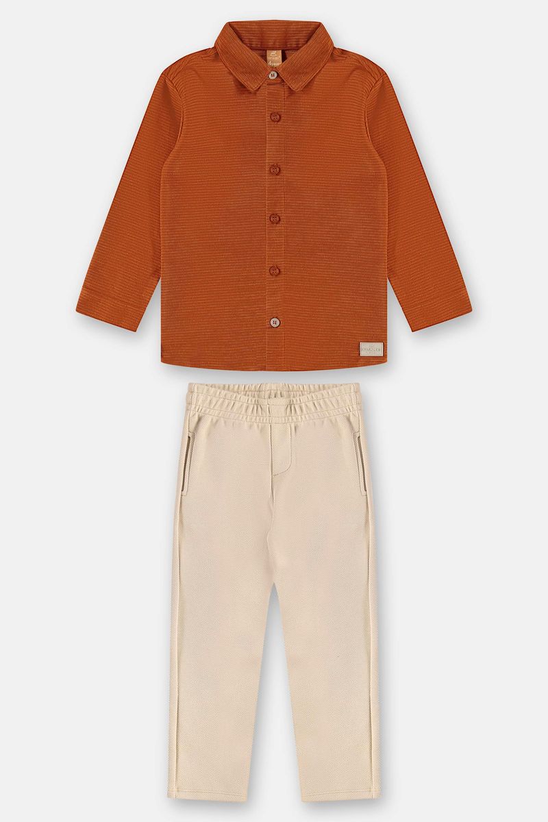 Conjunto infantil composto por camisa em malha veludo canelada (algodão e poliéster) e por uma calça em malha alfaiataria (algodão, poliéster e elastano). A camisa conta com gola social, fechamento por botões, e punhos nas mangas com botão e caseado. A calça possui cós elástico para melhor ajuste, braguilha falsa e acabamento sofisticado.