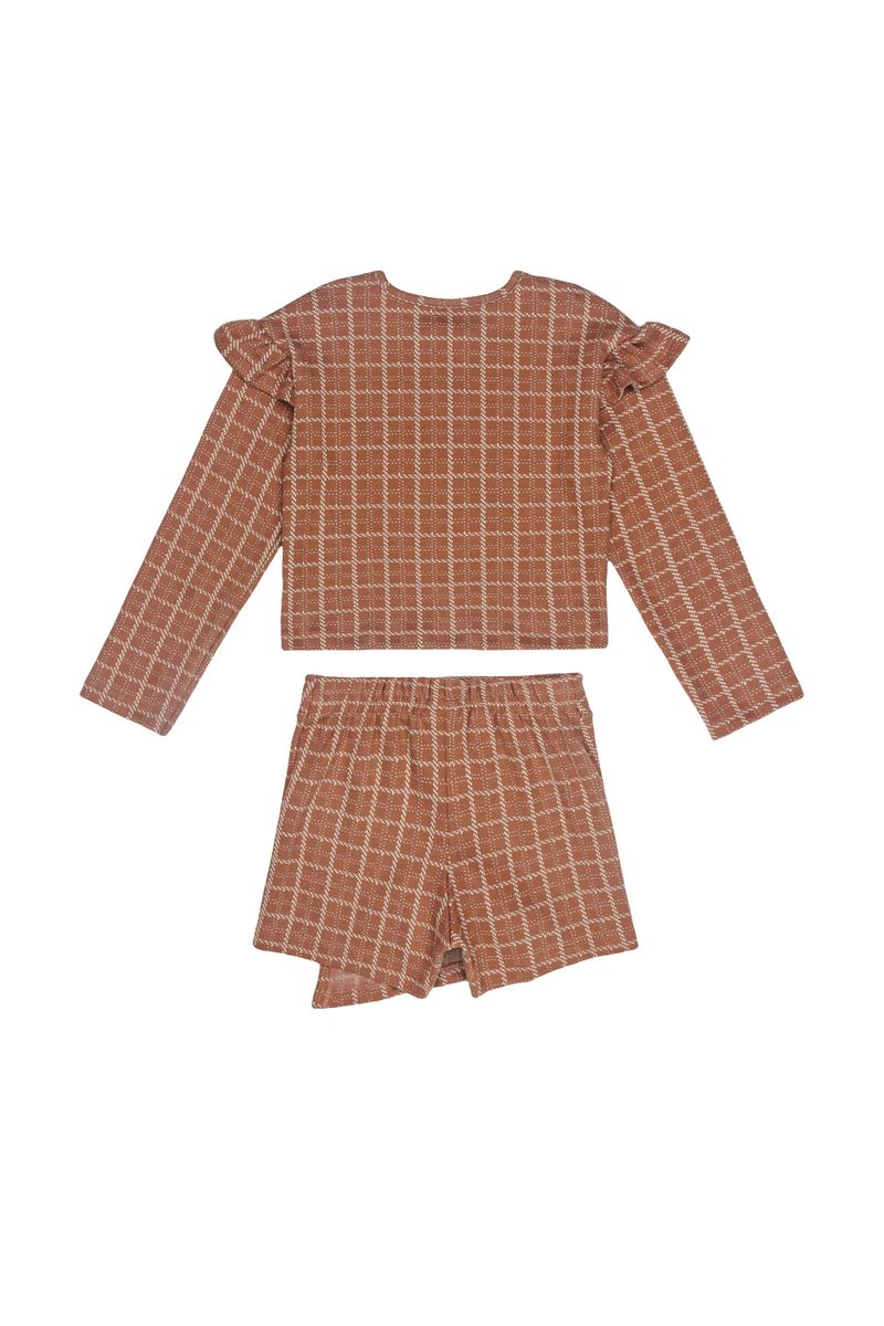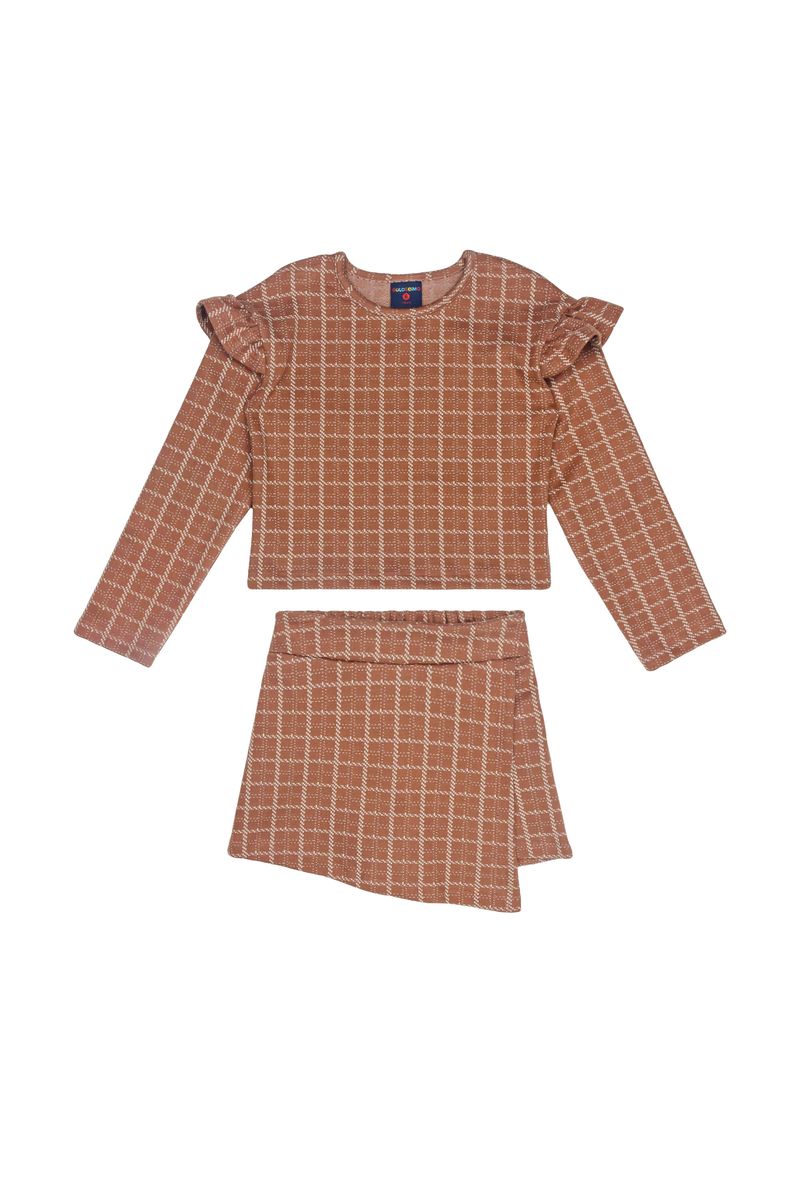 Conjunto infantil para menina composto por blusa e short-saia em malha jacquard xadrez (poliéster, algodão e elastano). A blusa possui cava deslocada com babado franzido, e gola redonda. O short-saia tem cós com elástico embutido para melhor ajuste e detalhe sobreposto na frente. Um conjunto moderno e confortável para diferentes ocasiões.