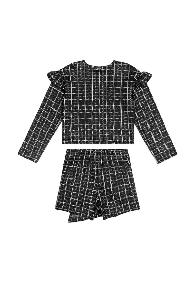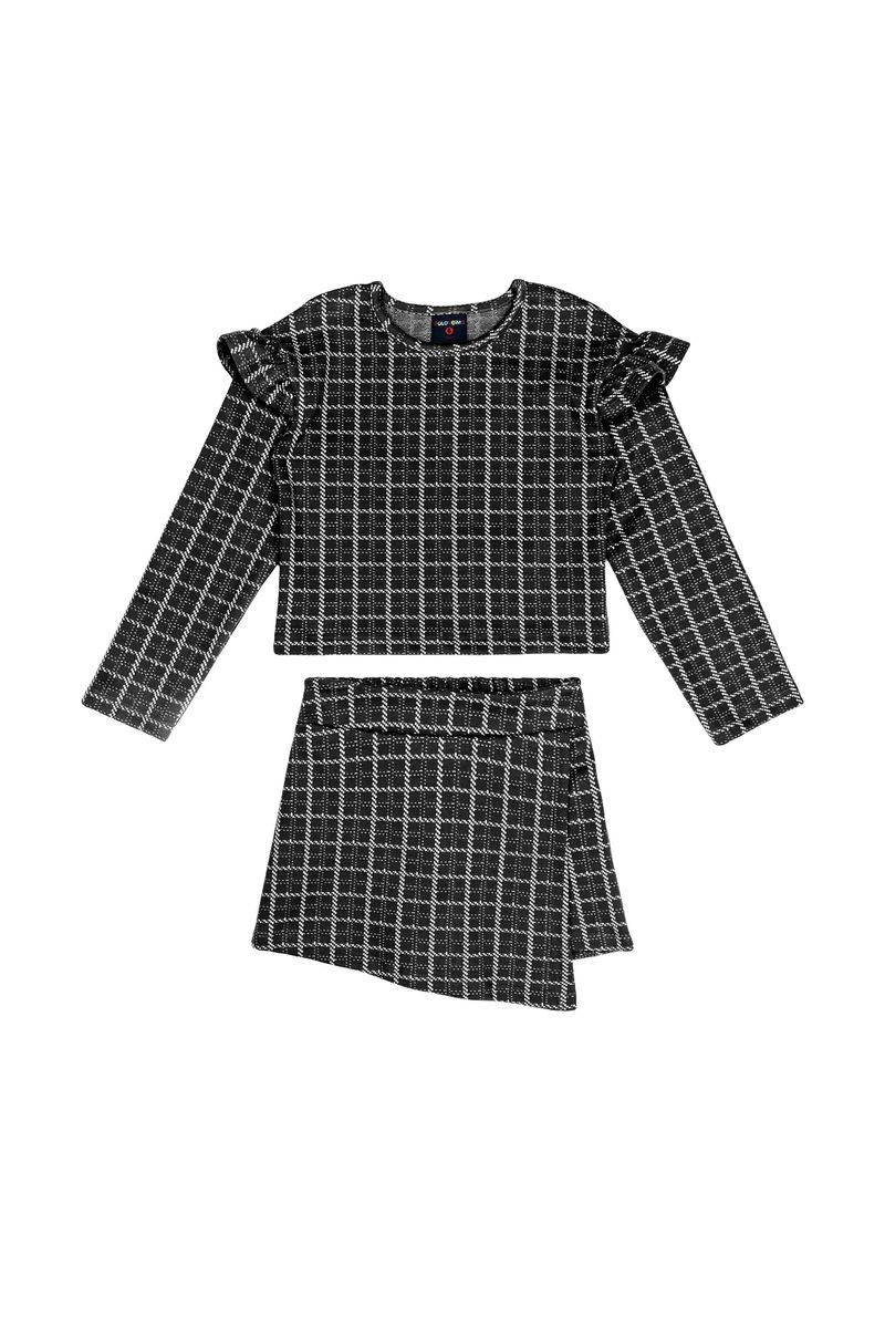 Conjunto infantil para menina composto por blusa e short-saia em malha jacquard xadrez (poliéster, algodão e elastano). A blusa possui cava deslocada com babado franzido, e gola redonda. O short-saia tem cós com elástico embutido para melhor ajuste e detalhe sobreposto na frente. Um conjunto moderno e confortável para diferentes ocasiões.