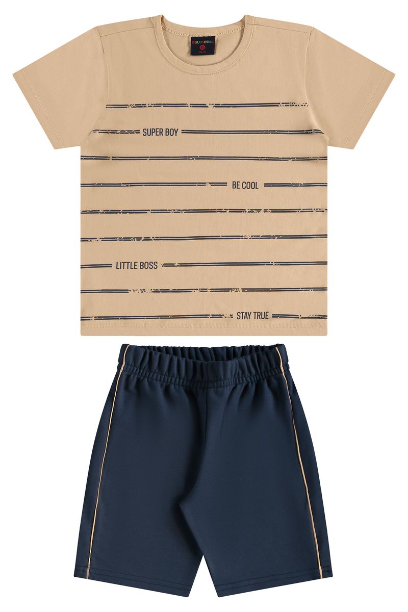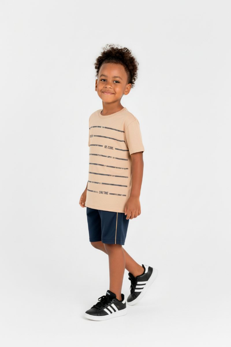 Conjunto infantil para menino, ideal para um look estiloso e confortável. A camiseta de meia malha, leve e macia, possui uma estampa listrada que garante um visual descolado e cheio de personalidade. A bermuda de moletom complementa o look com um toque esportivo, apresentando listras laterais e cós elástico que proporciona ajuste confortável e total liberdade de movimento. Perfeito para o dia a dia.