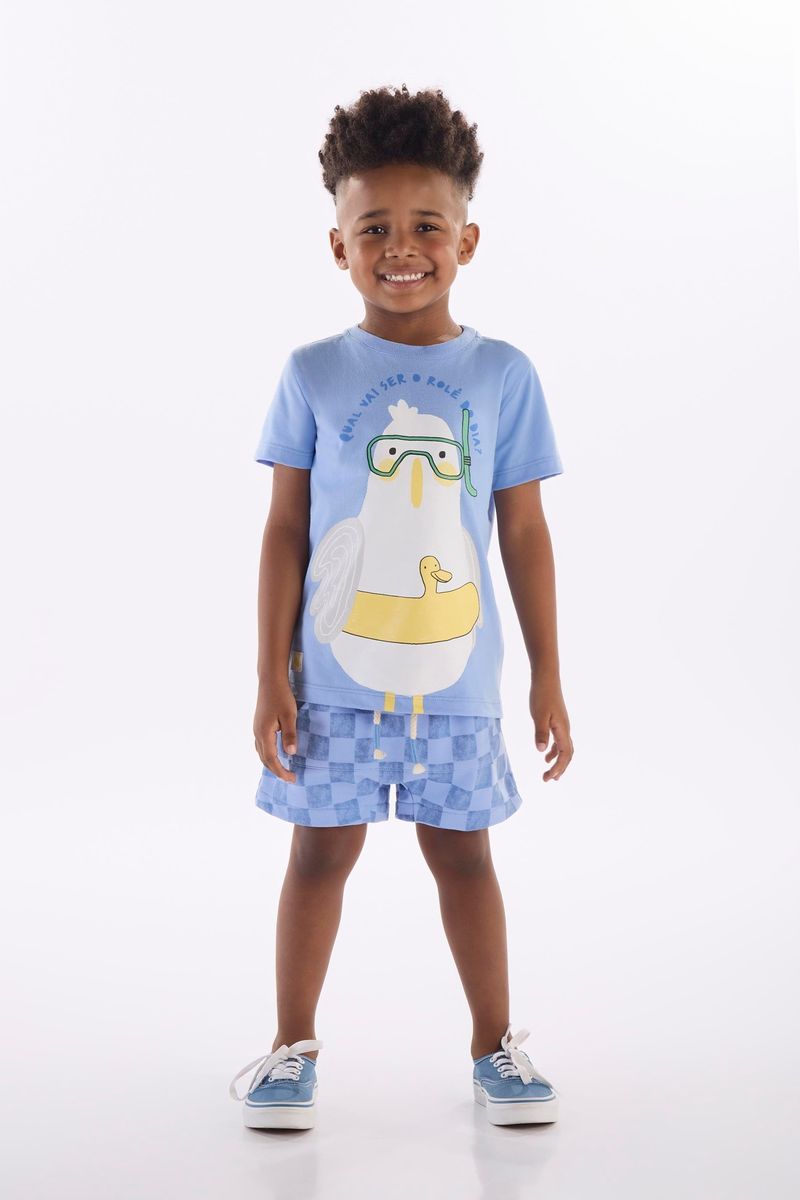 Este conjunto infantil masculino, ideal para os dias ensolarados, é composto por uma camiseta de meia malha e uma bermuda em moletom sem felpa. A camiseta exibe uma estampa divertida de gaivota com a frase "Qual vai ser o rolê do dia?", gola redonda em ribana e mangas curtas. A bermuda conta com cós elástico com cadarço, um bolso funcional e uma padronagem quadriculada. Uma escolha leve e descontraída para passeios, brincadeiras e momentos de lazer.