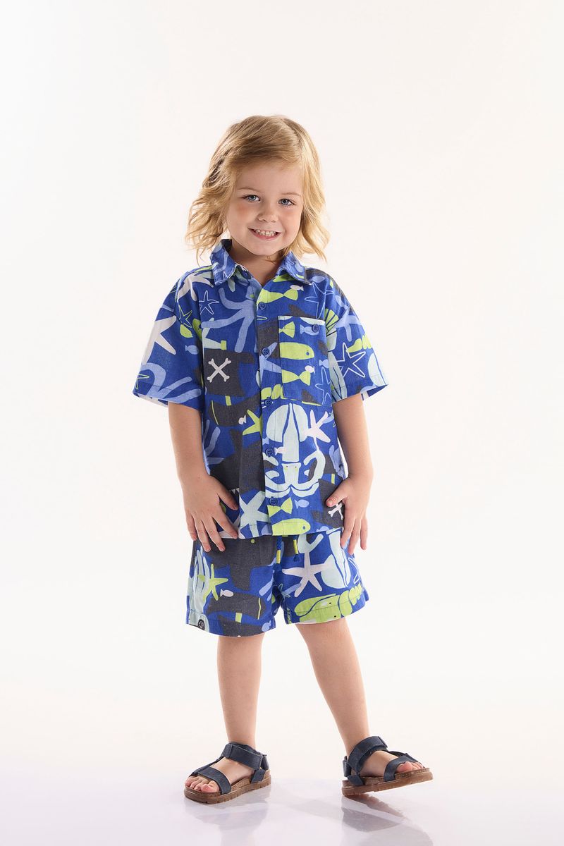 Para meninos, este conjunto infantil inclui uma camisa e um short, ambos confeccionados em viscolinho com estampa digital. Isso garante cores vibrantes e detalhes nítidos, sendo perfeito para ocasiões casuais que exigem estilo e praticidade. A camisa apresenta gola e pé duplos, fechamento completo com botões e casa, e um bolso funcional com botão central. O short possui elástico e cadarço decorativo na cintura para um ajuste confortável e ideal, além de bolsos funcionais que conferem maior utilidade ao visual.
