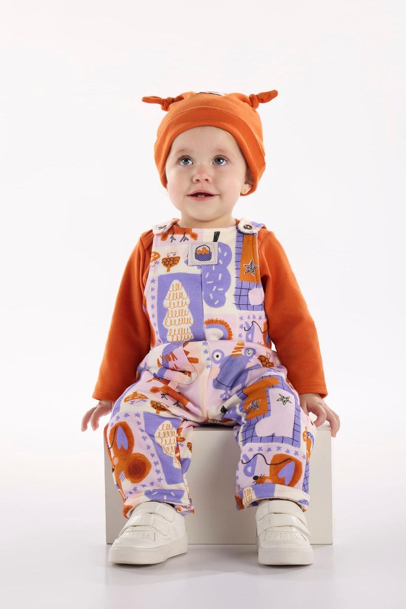 Perfeito para bebês meninas, este conjunto infantil inclui um body de manga longa em suedine (algodão) e uma jardineira. O body apresenta botões de pressão entre as pernas para trocas rápidas e práticas. A jardineira, confeccionada em moletom sem felpa com viscose, possui alças ajustáveis com botões e caseados, um bolso frontal estampado e barra dobrada. Sua estampa digital oferece cores vibrantes e alta definição aos desenhos.