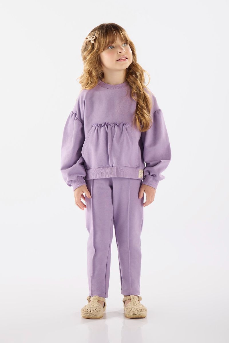 Feito em molecotton sustentável, esse conjunto é pura maciez. A blusa tem modelagem soltinha, mangas franzidas e gola, punhos e barra em ribana canelada. O bolso frontal dá um toque moderno. Já a calça tem cós elástico com cadarço decorativo, garantindo um ajuste perfeito. Ideal para acompanhar as pequenas em qualquer aventura com muito conforto.