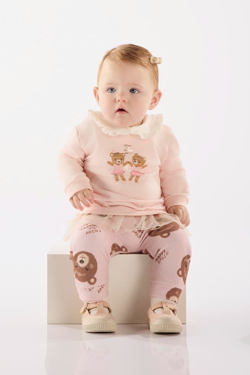 Esse look é quentinho e cheio de charme. A blusa de molecotton felpado tem um toque macio e aconchegante, com estampa fóil delicada e detalhe em tule na barra para um visual super fofo. A gola conta com botões de pressão para facilitar na hora de vestir. A calça saruel de malha comfy tem um caimento soltinho, punhos ajustados e muito conforto.