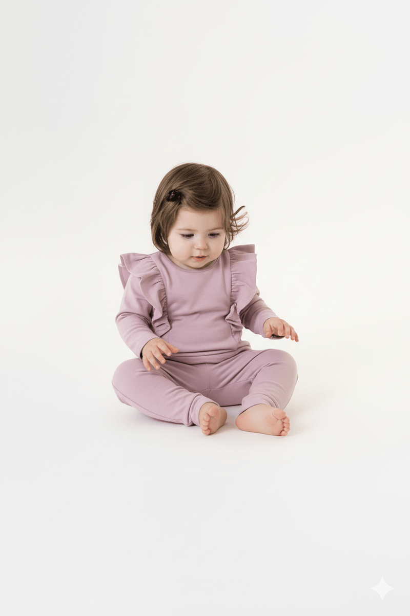 Conjunto para bebê menina confeccionado em molecotton com felpa (algodão e elastano), oferecendo conforto e aquecimento para os dias frios. A blusa possui recortes com babado levemente franzido nas mangas. A calça conta com cós elástico e nervura frontal, proporcionando ajuste confortável e visual moderno. Um conjuntinho prático e estiloso para acompanhar as pequenas com leveza.
