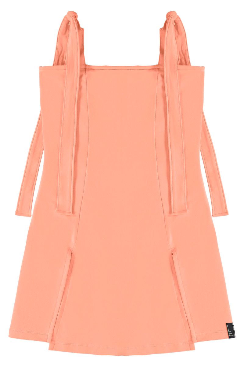 • Macaquinho infantil em molecotton, com alças com nó, sobreposição que imita vestido com fendas frontais e etiqueta personalizada da marca.