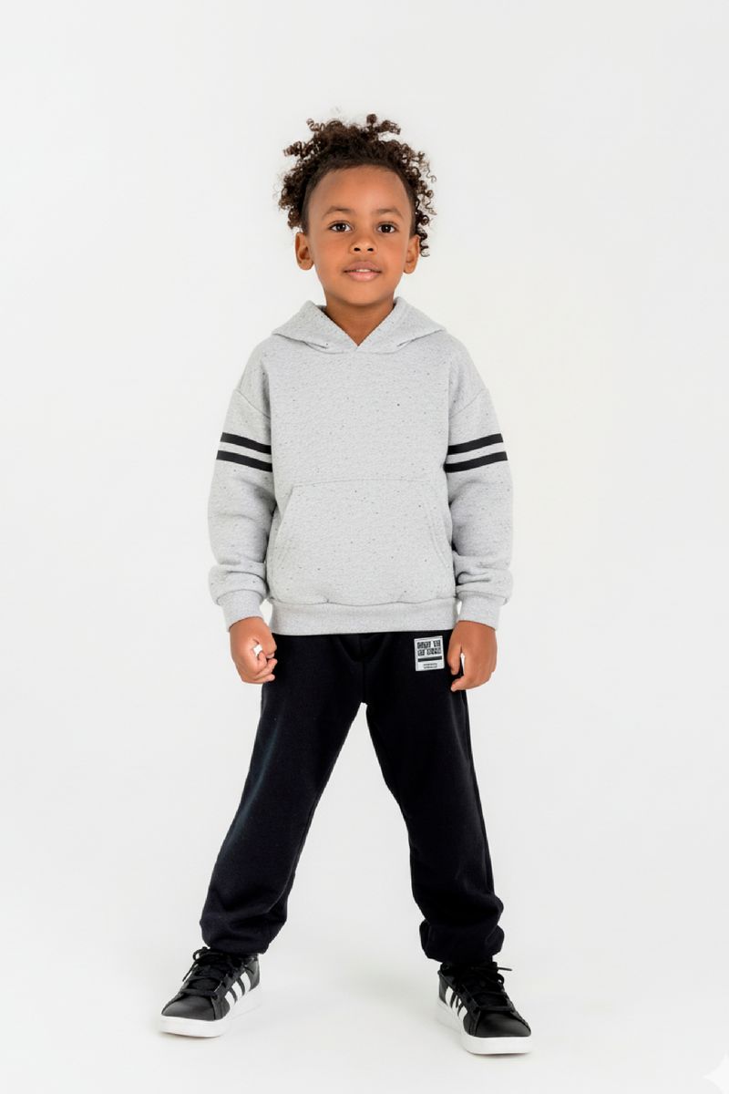 Conjunto infantil para menino, composto por um blusão confeccionado em moletom botonê e uma calça em moletinho. O blusão conta com um capuz, bolso canguru frontal, elástico na barra e nos punhos, além disso, complementando a peça, possui filetes duplos verticais nas mangas. A calça possui elástico na cintura e punhos, além de uma estampa que adiciona toque extra de charme a peça.