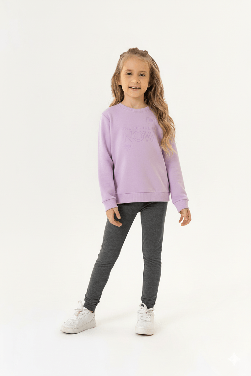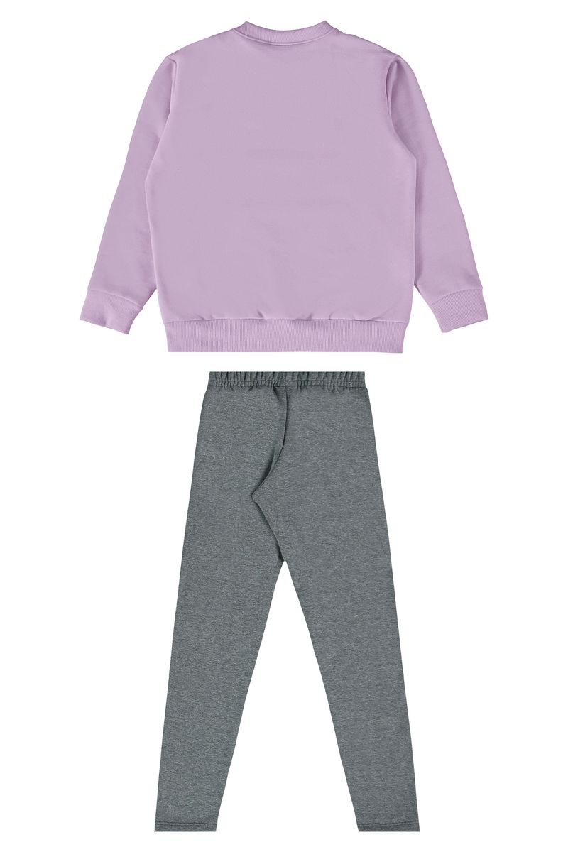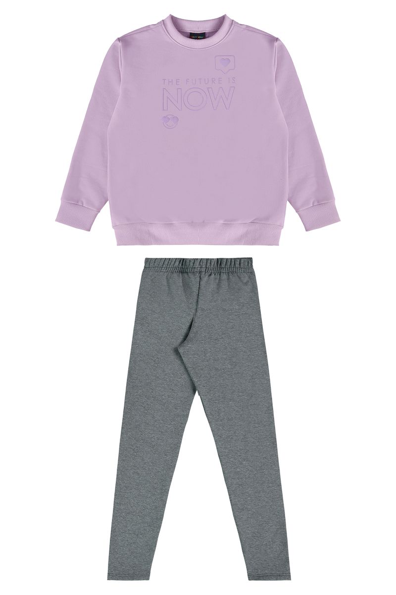 Conjunto infantil para meninas, composto por um blusão confeccionado em moletom e por uma calça legging em molecotton. O blusão possui gola redonda e estampa com escritas, com um coração e um emoji. A calça possui elástico na cintura e padronagem básica e lisa, que facilita a criação de diversas combinações com outras peças. As duas peças possuem felpa (peluciado interno).