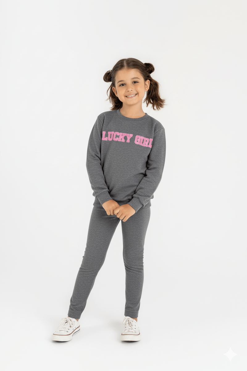 Conjunto infantil para meninas, composto por um blusão e uma calça legging em molecotton Peluciado. O blusão possui gola redonda, estampa com escrita, e barra e punhos com elástico. A calça possui elástico na cintura e um padrão simples e discreto em cores básicas, sendo fácil de combinar com outras peças.