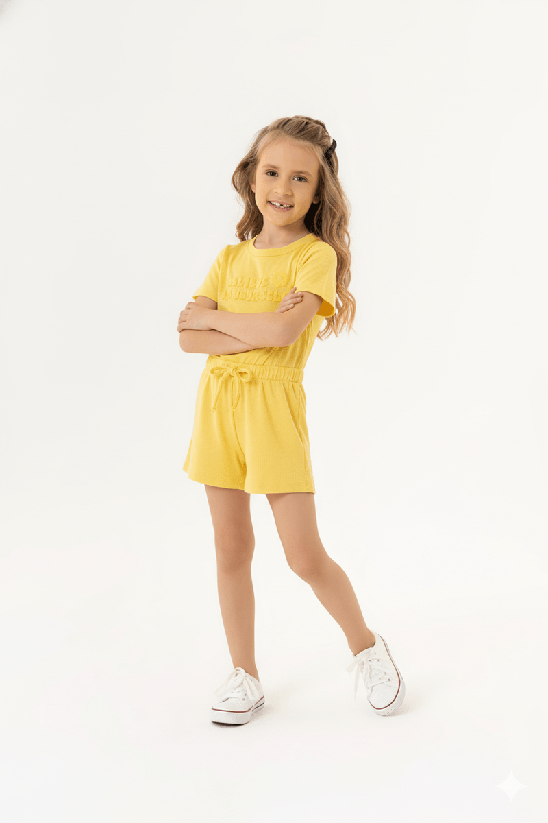 Macaquinho infantil para menina, confeccionado em malha canelada. Destaca-se pela estampa em gel com a inspiradora mensagem "Believe in Yourself", adicionando um toque moderno e divertido. A peça é complementada por um cordão decorativo na cintura, que adiciona charme e permite um ajuste perfeito.