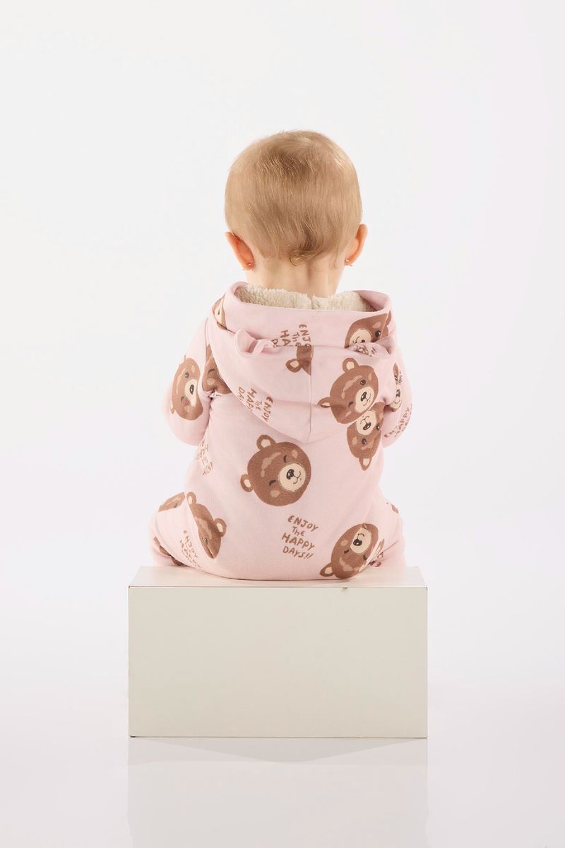 Macacão para bebê menina confeccionado em malha comfy peluciada (poliéster e elastano) com forro em pelo sintético (poliéster), perfeito para manter sua pequena aquecida e confortável nos dias mais frios. Conta com capuz com orelhinhas, fechamento por zíper com dois cursores, punhos ajustáveis, e o modelinho saruel, que oferece mais liberdade de movimento. Sua estampa de ursinhos traz maior destaque a peça, deixando-a ainda mais especial.