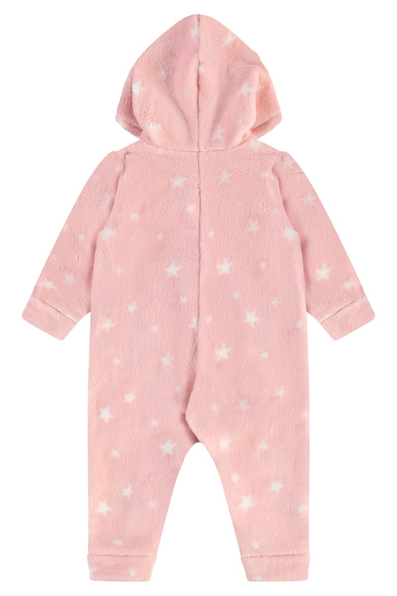 Macacão para bebê menina confeccionado em pelo sintético (poliéster). Possui capuz, zíper frontal fixo, que facilita o vestir e protege do vento. Seu tecido estrelado traz um toque lúdico e encantador à peça. Possui também punhos e caimento confortável, perfeito para manter sua pequena aquecida com muito estilo e delicadeza no inverno.