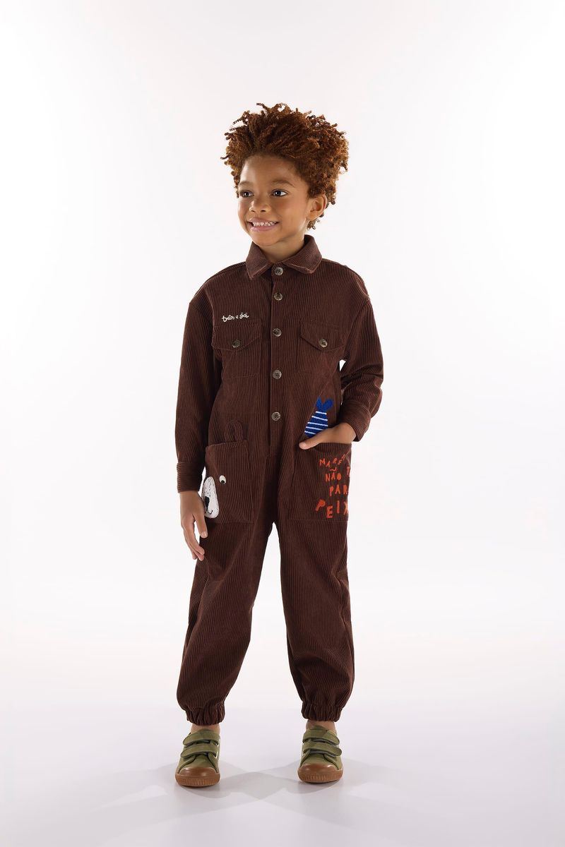 Este macacão infantil para meninos é feito de veludo cotelê 100% poliéster. O design apresenta abertura frontal com botões, gola dupla entretelada e bolsos funcionais para praticidade e um ajuste estruturado. Bordados e patches decorativos trazem um charme lúdico, e o elástico embutido na cintura oferece conforto extra e mobilidade.