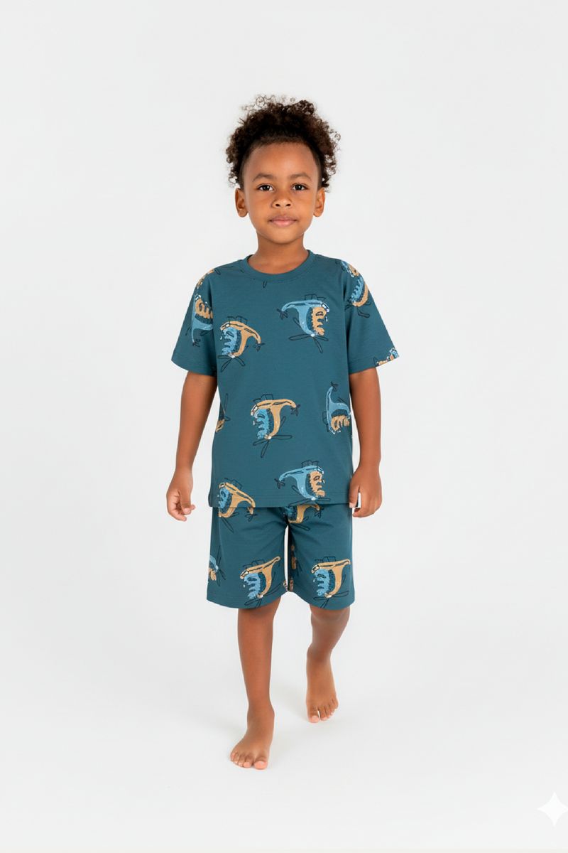 Pijama infantil para menino, feito em meia malha (algodão), ideal para garantir noites fresquinhas e confortáveis. O conjunto é composto por camiseta com gola redonda e bermuda com elástico na cintura, facilitando o vestir. Possui estampa sublimada com tema de dinossauro em diferentes cores, adicionando diversão ao visual noturno. Uma escolha prática e cheia de charme para o dia a dia.