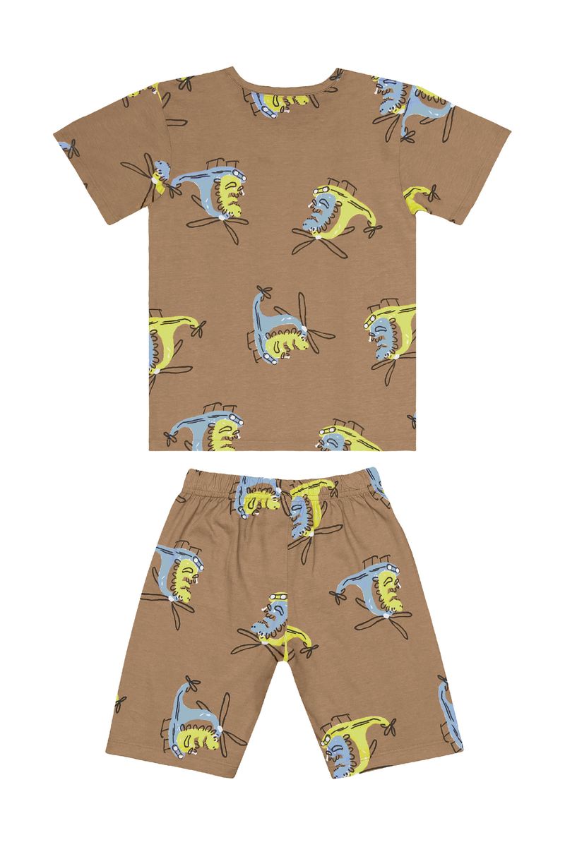 Pijama infantil para menino, feito em meia malha (algodão), ideal para garantir noites fresquinhas e confortáveis. O conjunto é composto por camiseta com gola redonda e bermuda com elástico na cintura, facilitando o vestir. Possui estampa sublimada com tema de dinossauro em diferentes cores, adicionando diversão ao visual noturno. Uma escolha prática e cheia de charme para o dia a dia.