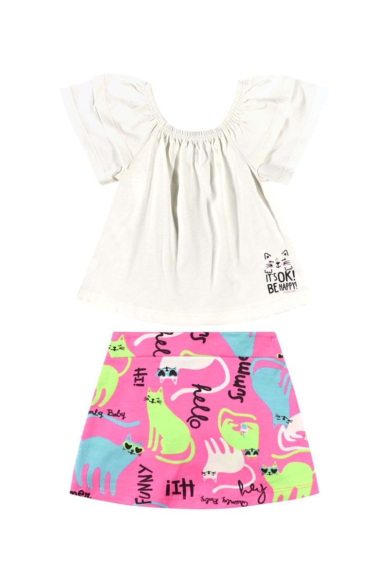 Conjunto para bebê menina. A blusa, confeccionada em meia malha, apresenta mangas raglan com delicados babados e uma estampa minimalista de gatinho, adornada com glitter para um toque de brilho especial. A saia, feita em cotton, traz uma estampa divertida com vários gatinhos, garantindo que as pequenas fiquem ainda mais fofas e divertidas.