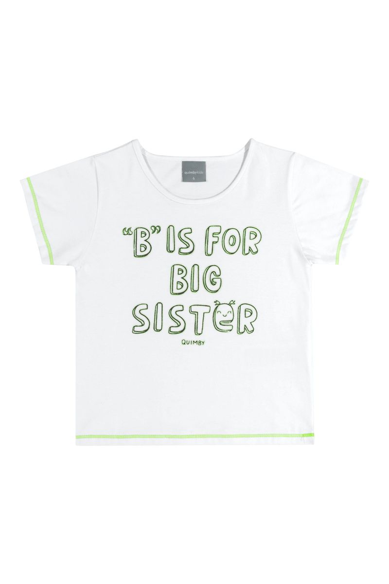 Pijama infantil para menina composto por uma blusa e um short, ambos confeccionados em meia malha, garantindo maciez e suavidade para uma noite de sono tranquila. A blusa apresenta uma gola redonda confortável e mangas curtas que permitem maior liberdade de movimento durante o sono. A estampa é o destaque, com elementos em 3D e a escrita "B is For Big Sister", criando um visual encantador que as meninas vão adorar. O short complementa o conjunto com seu cós elástico na cintura, proporcionando um ajuste confortável e prático. A estampa de letrinhas dá um toque divertido e descontraído ao conjunto. Deixe-as aproveitarem suas noites de sono com conforto e estilo com este conjunto encantador.