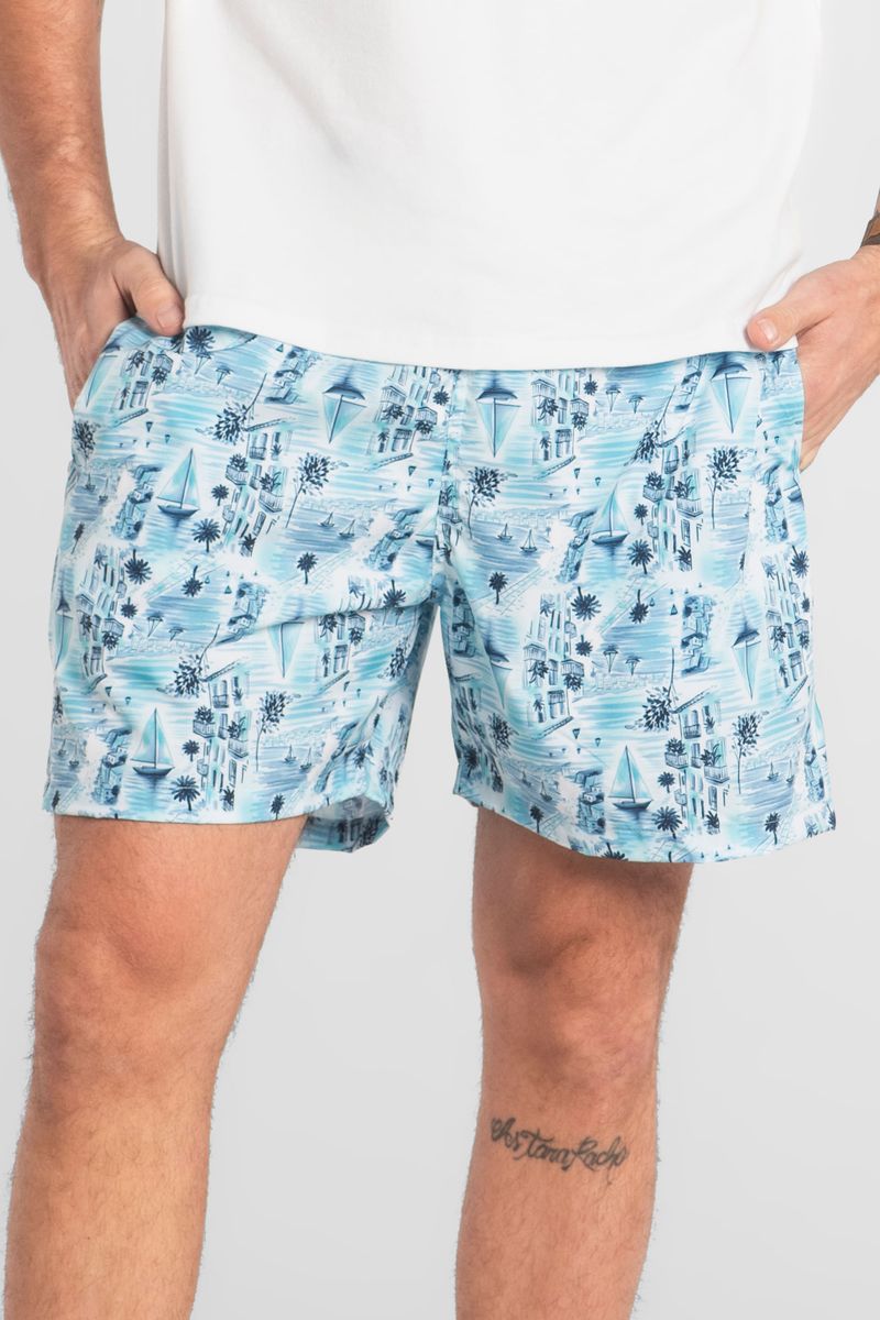 Shorts masculino confeccionado em microfibra (poliéster e elastano), com estampa e tecido leve de secagem rápida que garante conforto durante todo o dia. Possui cós elástico com cadarço funcional na cintura, bolsos frontais com forro e bolso retangular na parte traseira. Uma peça que combina conforto e estilo, perfeita para os dias de verão.