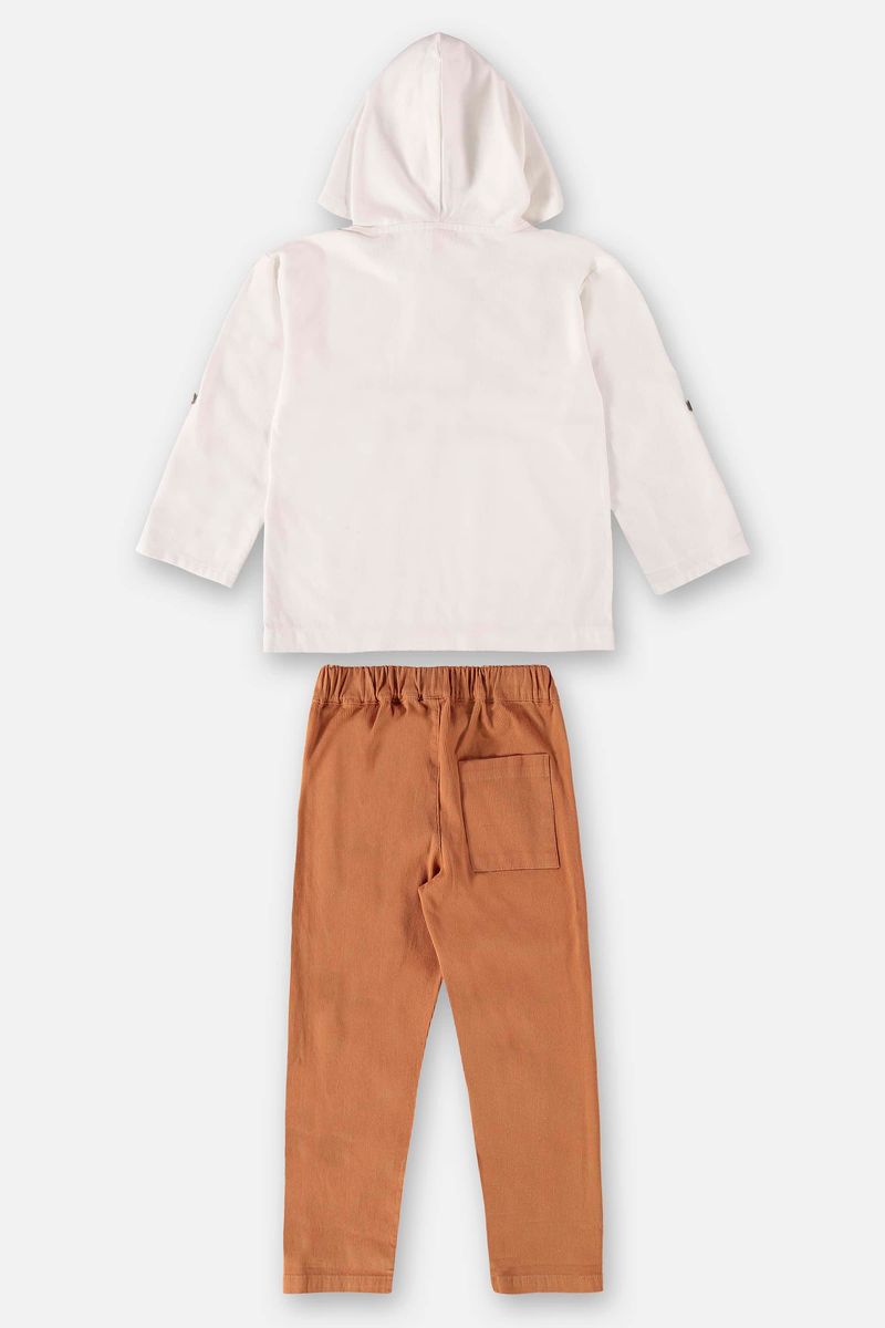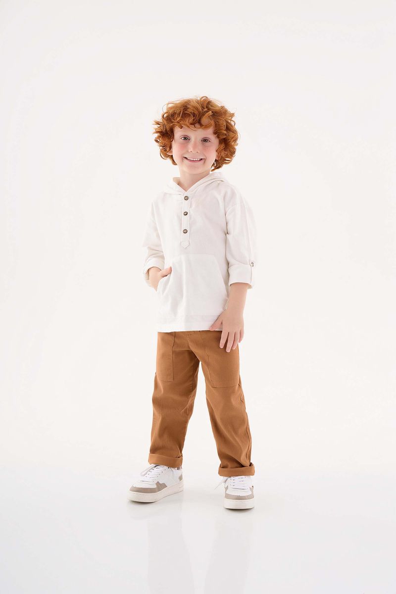 Conjunto infantil Menino composto por uma bata e uma calça. A bata confeccionada em tecido flanelado, possui um bolso canguru funcional, capuz e peitilho com fechamento em botões, martingale nas mangas e etiqueta decorativa em corino na lateral. A calça, em linho, é elegante e versátil, com bolsos frontais, um bolso traseiro e fechamento com botão na cintura, efeito de lavanderia e, nos tamanhos de 04 a 10 conta com braguilha funcional com zíper.