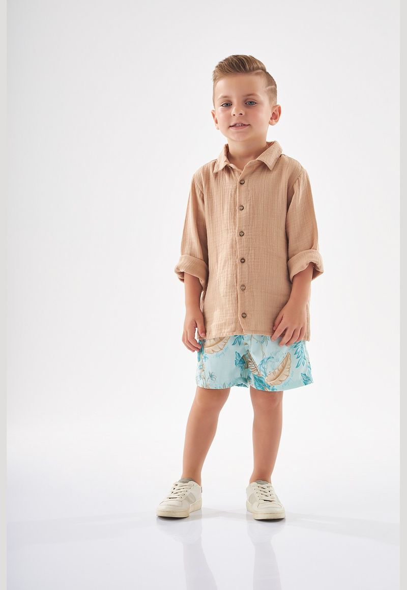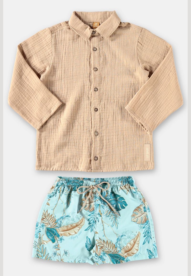 Conjunto Up Baby infantil para os meninos ficarem elegantes e confortáveis. É composto por camisa polo manga longa em tecido gaze texturizado, com fechamento frontal total por botões talhados em casaca de coco, com etiqueta personalizada da marca na barra e bermuda em microfibra com estampa total tropical e elástico no cós ajustável por cordão. Perfeito para ocasiões especiais e passeios na praia.