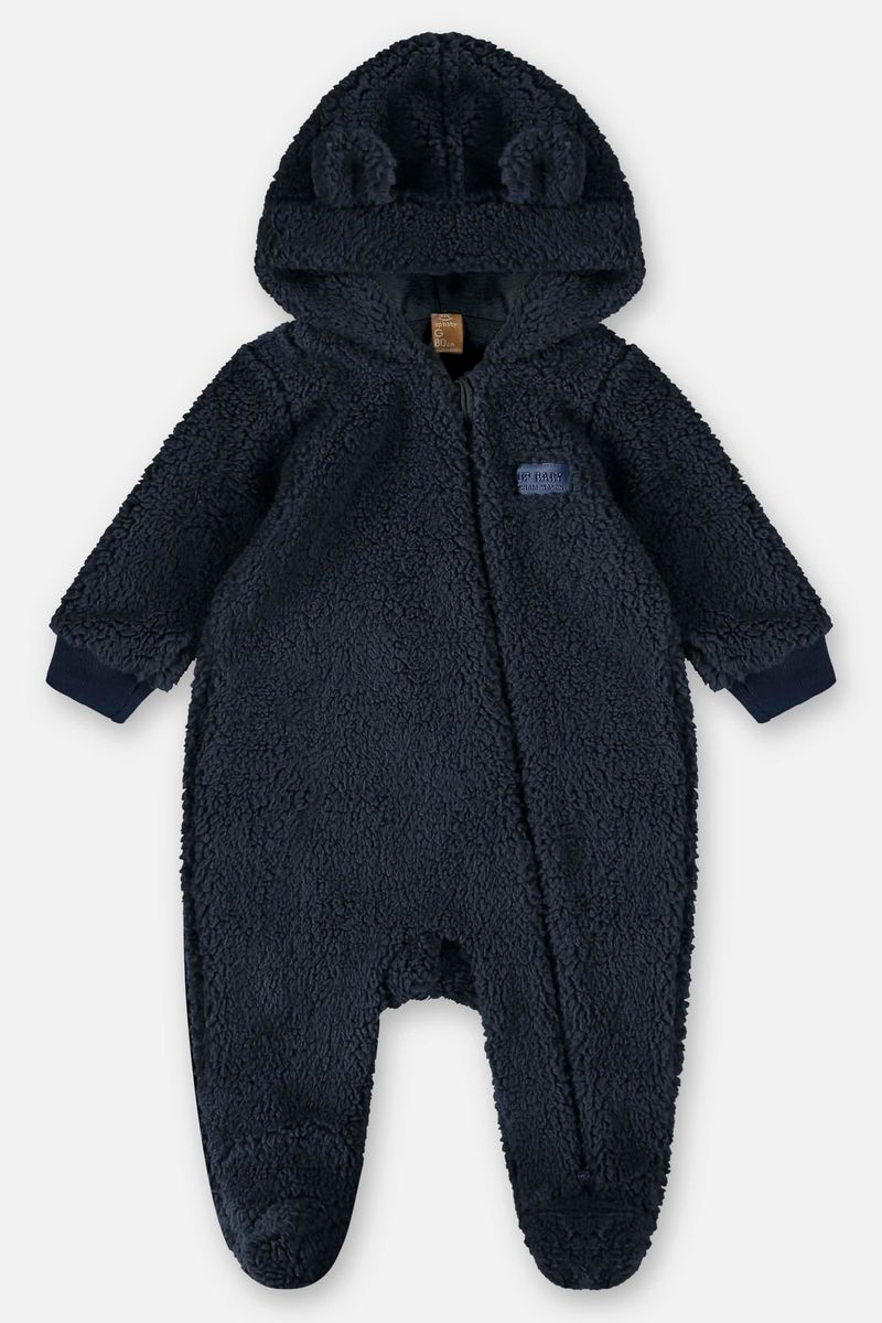 Macacão unissex para bebês, confeccionado em material sintético, que simula pelo. Possui forro em meia malha, capuz com o aplique de orelhinhas, abertura frontal por zíper, pezinhos incorporados no macacão (somente nos tamanhos P, M e G). Além disso, possui gancho saruel e punhos em ribana.