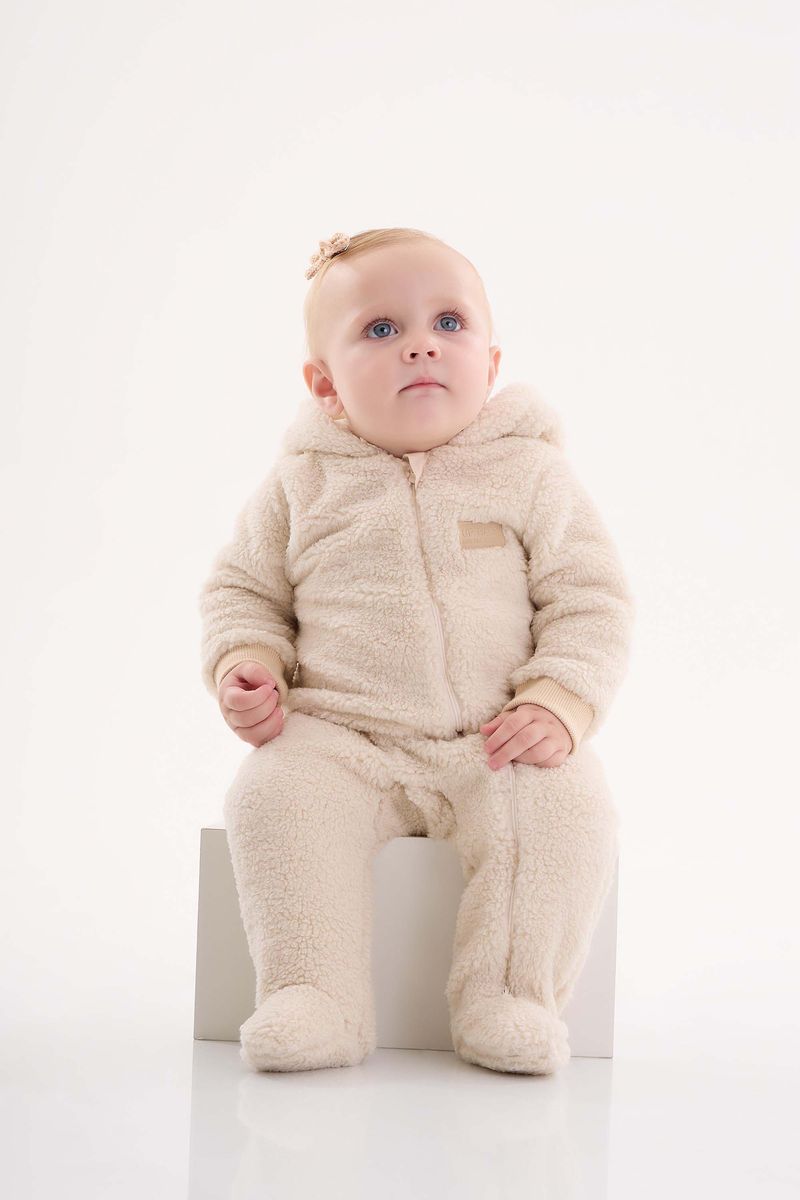 Macacão unissex para bebês, confeccionado em material sintético, que simula pelo. Possui forro em meia malha, capuz com o aplique de orelhinhas, abertura frontal por zíper, pezinhos incorporados no macacão (somente nos tamanhos P, M e G). Além disso, possui gancho saruel e punhos em ribana.