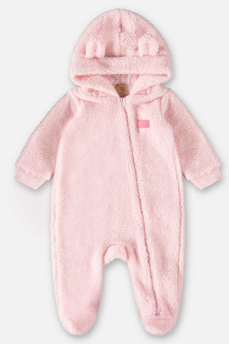 Macacão unissex para bebês, confeccionado em material sintético, que simula pelo. Possui forro em meia malha, capuz com o aplique de orelhinhas, abertura frontal por zíper, pezinhos incorporados no macacão (somente nos tamanhos P, M e G). Além disso, possui gancho saruel e punhos em ribana.