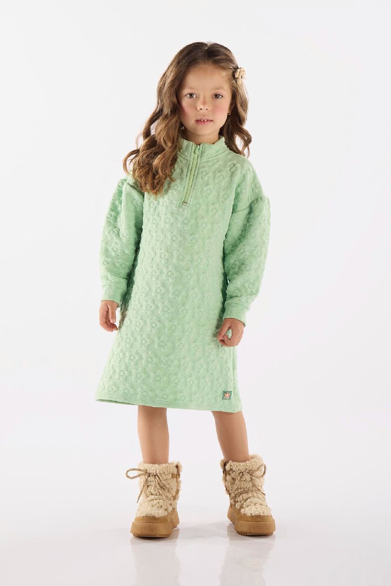 Vestido infantil para menina, confeccionado em matelassê, unindo conforto e elegância. A gola alta com zíper adiciona um toque moderno e estiloso, facilitando o vestir. As mangas longas com franzido trazem um charme delicado, enquanto os punhos ajustados garantem um caimento confortável. A estampa florida completa o visual com doçura e sofisticação.
