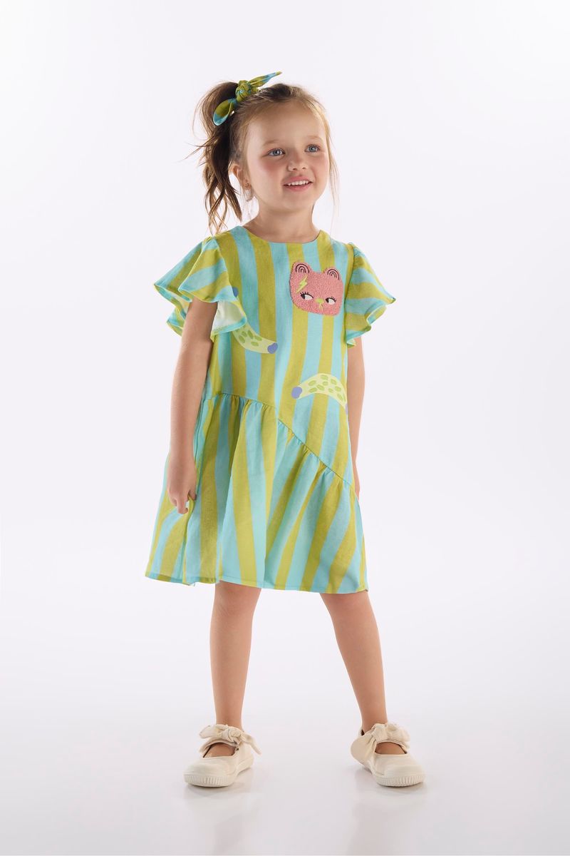 O vestidinho infantil da Três e Já é a fusão perfeita de delicadeza, frescor, estilo e praticidade. Confeccionado em viscose com linho, exibe uma estampa listrada e um bordado divertido. Possui mangas amplas e franzidas, recortes franzidos na frente e nas costas, e uma charmosa abertura traseira com laço rosa. Sua modelagem ampla proporciona um caimento leve e extremamente confortável, sendo a escolha ideal para os dias de verão.