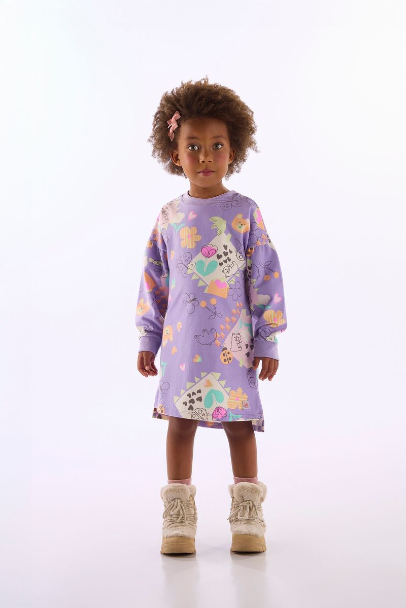O vestido infantil menina roxo em Super Cotton felpado é perfeito para aquecer com estilo. O tecido de algodão com elastano oferece toque macio e liberdade para brincar. A gola moldada com filete, punhos em ribana e estampa divertida deixam a peça ainda mais charmosa. Ideal para compor looks coloridos e confortáveis nos dias frios.