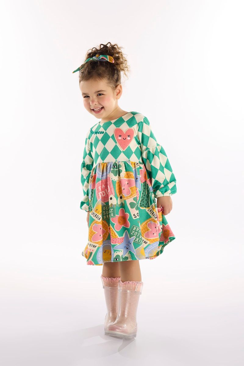 Este vestido infantil, ideal para um visual moderno e confortável, é confeccionado em molecotton com viscose sem felpa. Ele apresenta recortes franzidos na frente e nas costas, um patch termocolante de coraçãozinho no peito, elástico nas mangas para um ajuste aprimorado e uma fita delicada na gola. A peça conta ainda com estampa digital, que garante cores vibrantes e alta definição dos desenhos, mantendo o tecido macio, agradável e durável mesmo após diversas lavagens.